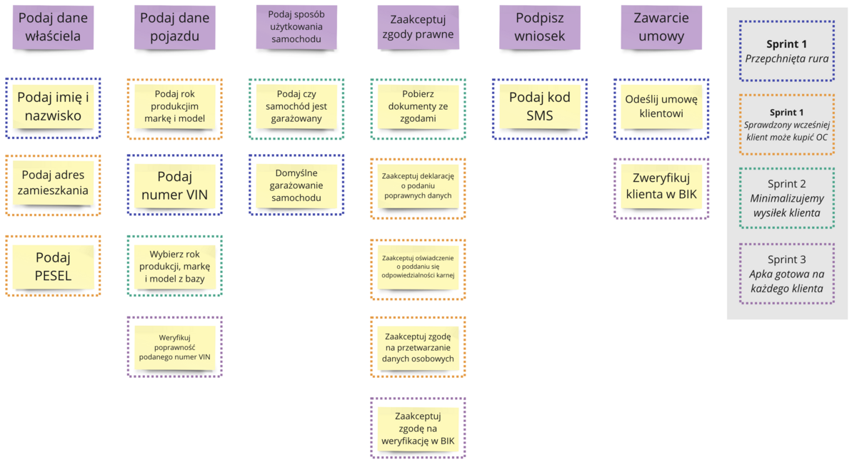 Na obrazku zamieściłem przy okazji notkę, w jaki sposób czytać te karteczkowe wyklejanki: Jako Właściciel samochodu, po to, aby podpisać wniosek (o polisę OC), mogę podać kod SMS. Odrazu uprzedzam. że taka karteczkowa analiza NIE jest tożsama ze specyfikacją wymagań i NIE jest tożsama z wymaganiami funkcjonalnymi. Karteczkowa analiza - do tego przykładu wykorzystałem fragment wyklejanki z warsztatu User Story Mapping - służy do moderowania grupy osób, do "wyciągania" z ich głów tego, co jest ważne, do konfrontowania punktów widzenia i do wykuwania wspólnego zrozumienia tego, co mamy dostarczyć.