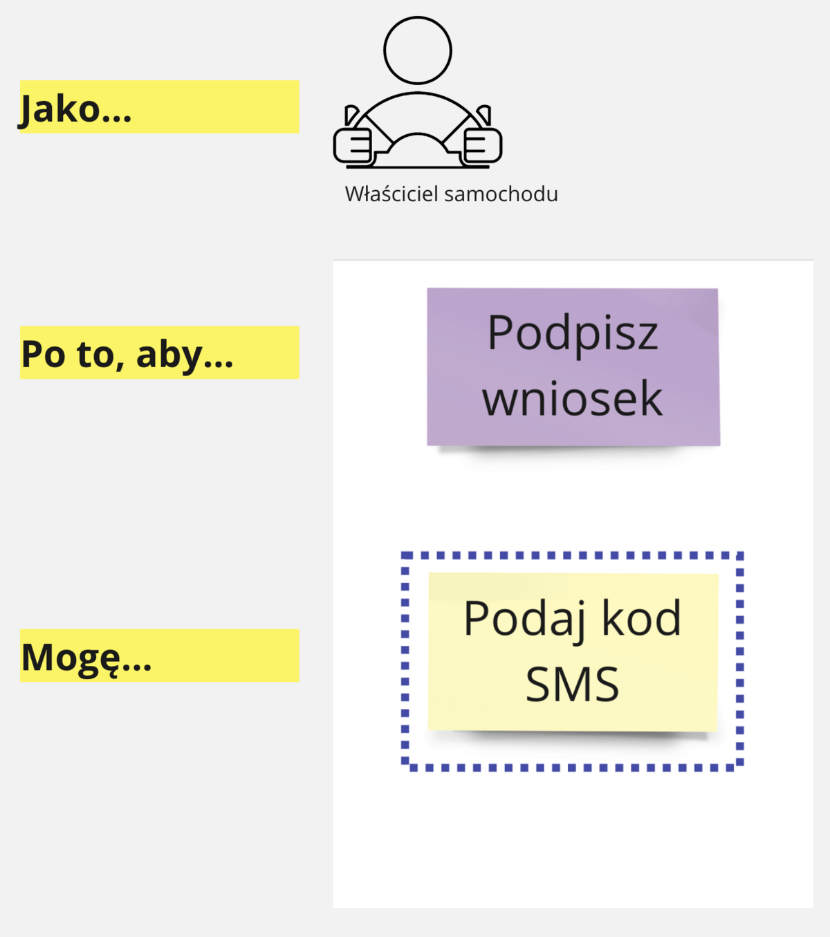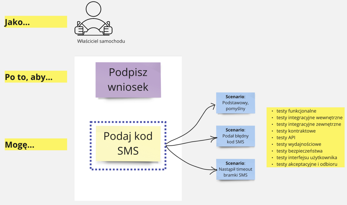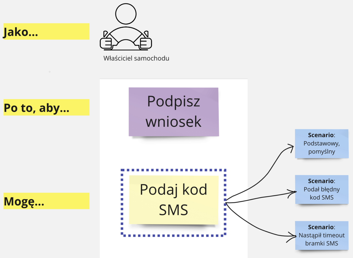 W pewnym momencie odkryliśmy, że właściciel samochodu chce podać kod SMS, aby podpisać wniosek. A jak konkretnie to podawanie kodu SMS działa, to doprecyzowują scenariusze Gherkin.