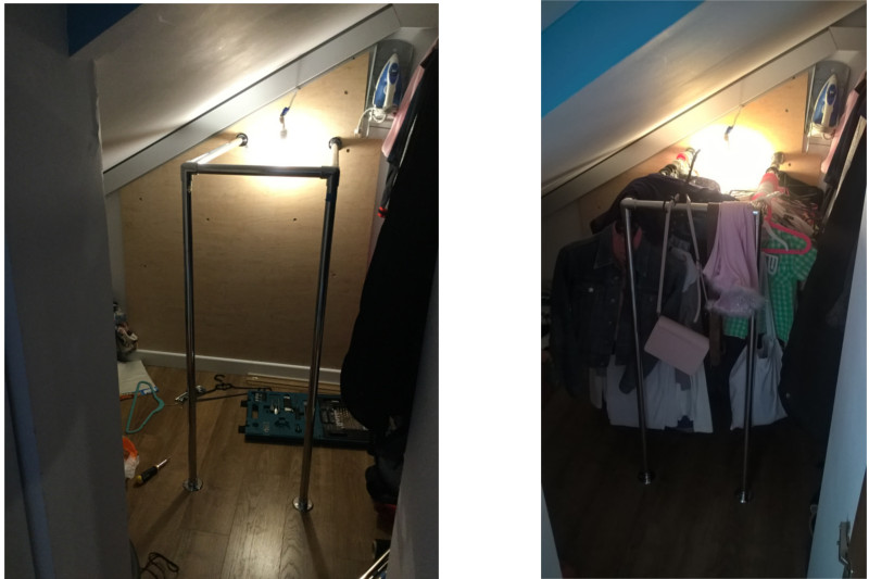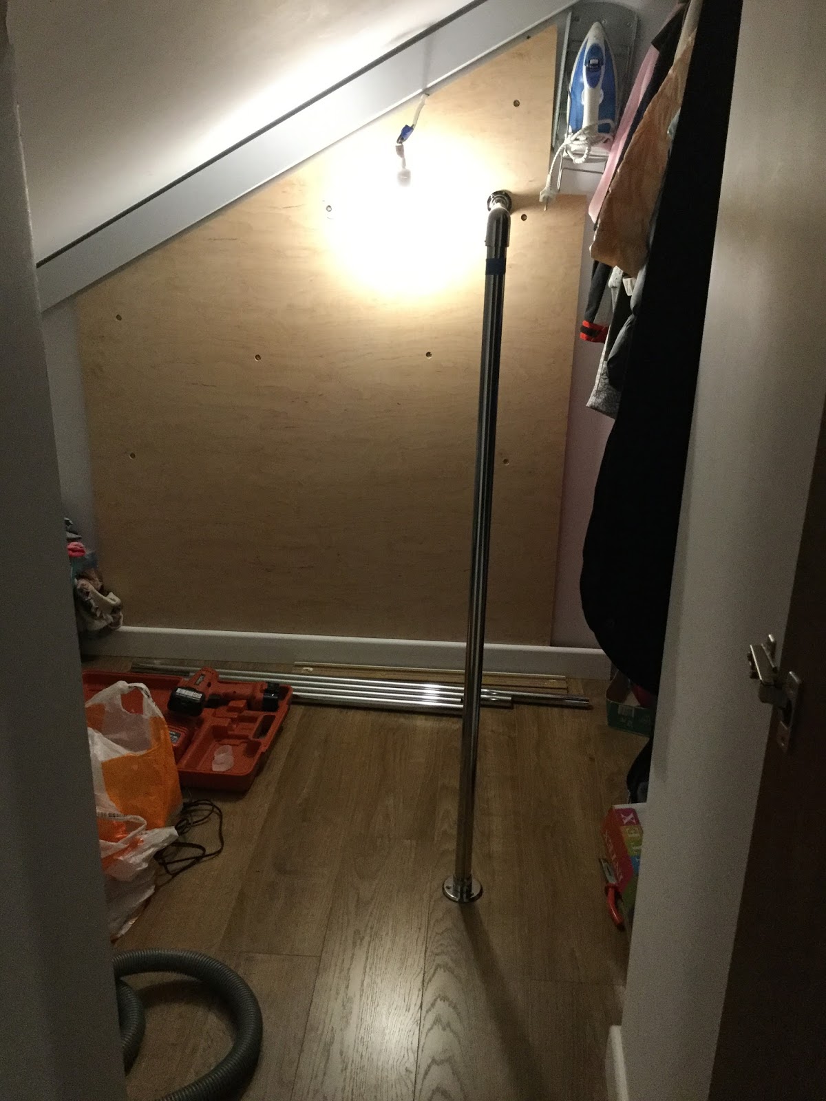 Żona zakontraktowała ze mną poprawę sytuacji wieszaków na ubrania w garderobie. Garderoba jest tak wygospodarowana za pomocą ścianek kartonowo-gipsowych z powierzchni mieszkania, że znajduje się pod dość spadzistą częścią połaci dachu.