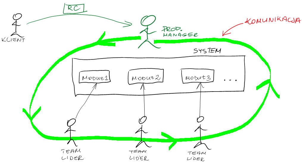 Product Manager jest raczej kimś kto dba o to by komunikacja pomiędzy liderami i zespołami przebiegała płynnie. Oczywiście będą trafiać do niego wszystkie CR, będzie posiadał dużą wiedzę biznesową i będzie doskonale znał produkt. Jego główny zadaniem będzie troszczenie się o produkt jako całość i pomaganie poszczególnym zespołom w komunikowaniu się z innymi i dogrywaniu wszelkich zmian.